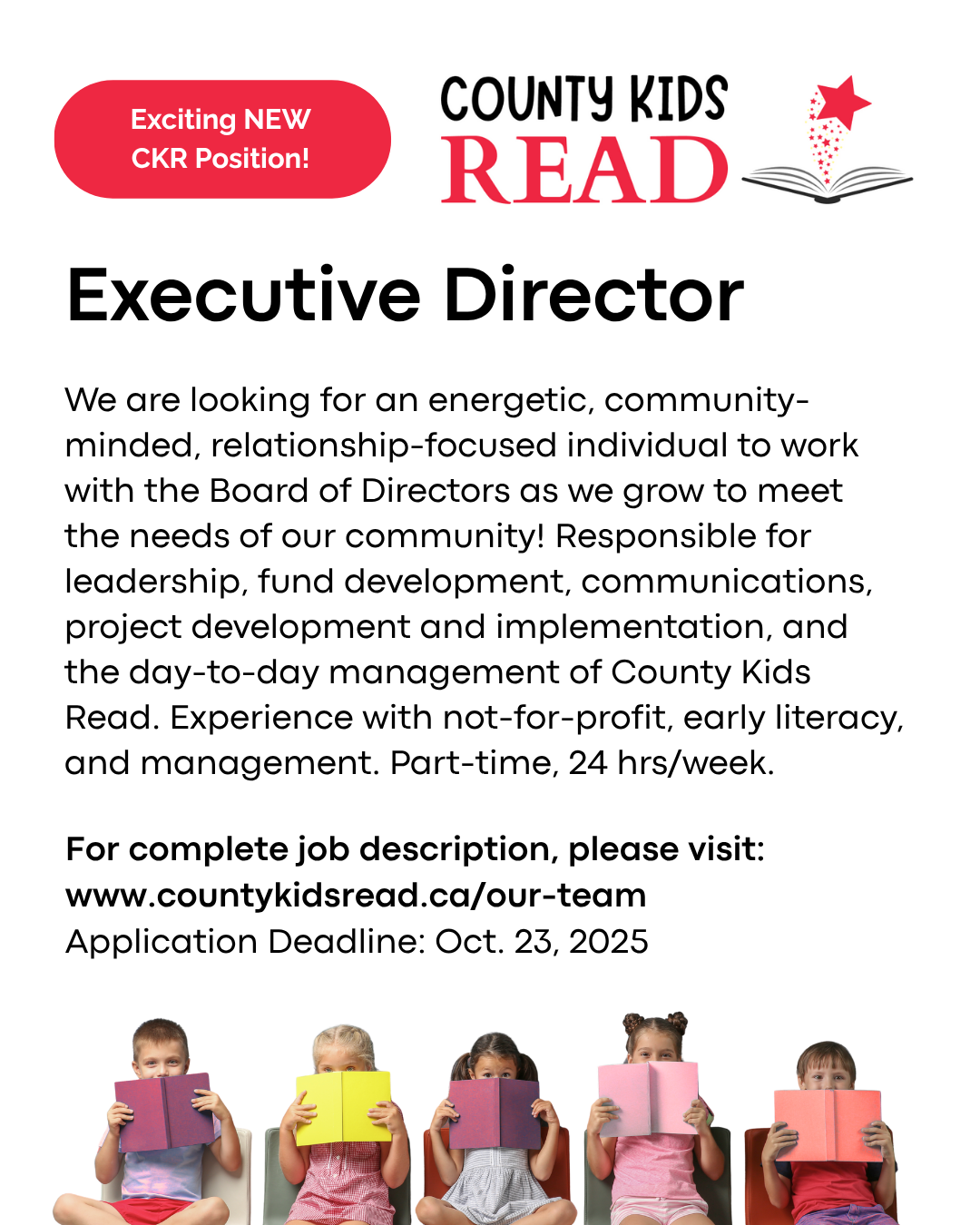 Resumes and cover letters should be submitted to Greg Bay at greg@countykidsread.ca.